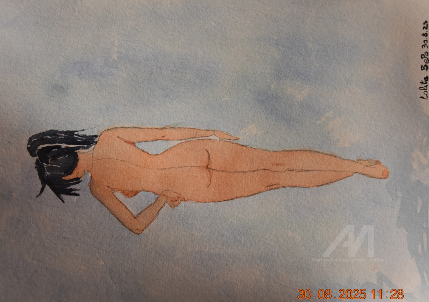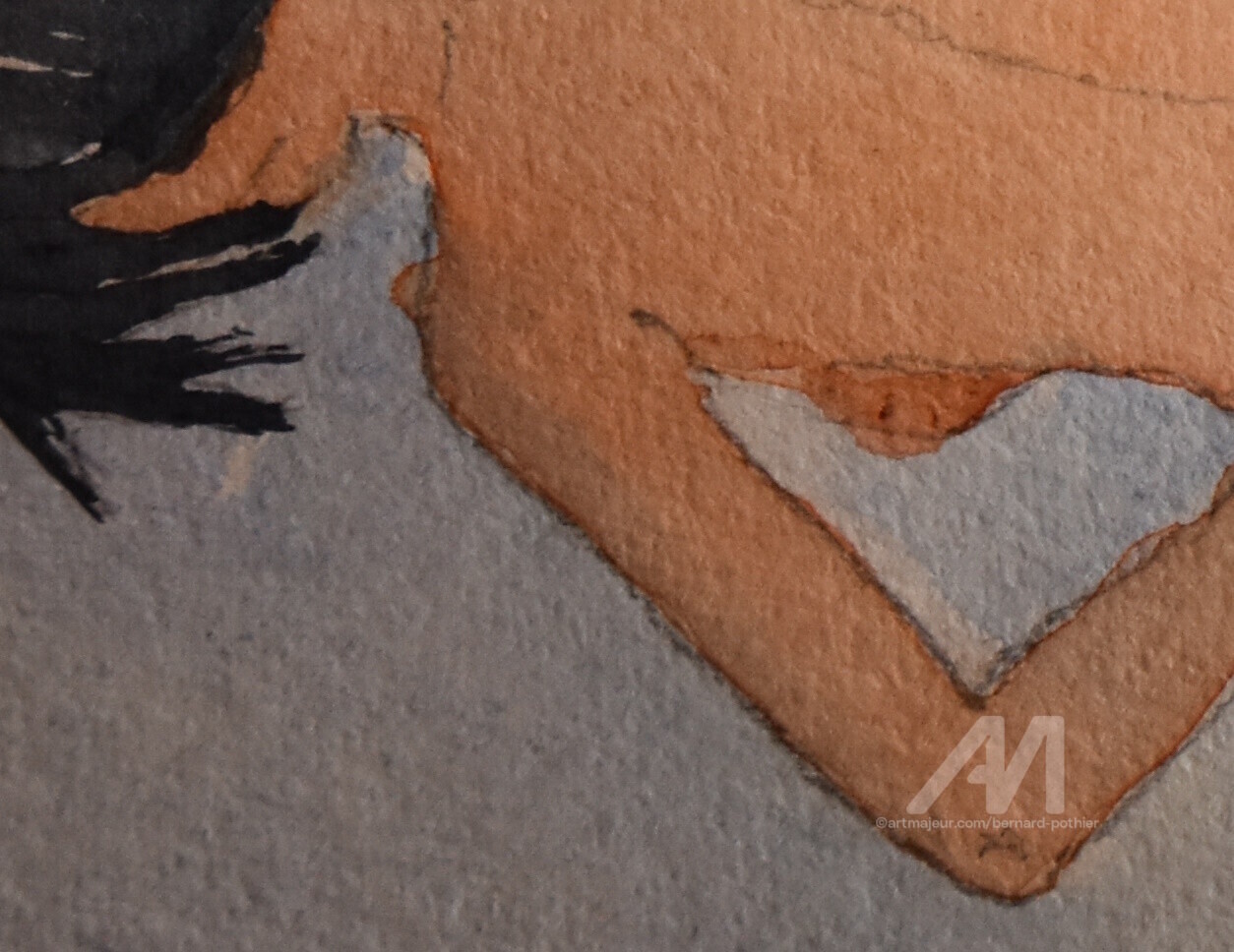 Représente une jeune femme brune debout, de dos, à la peau dorée par le soleil, coiffée à la diable...